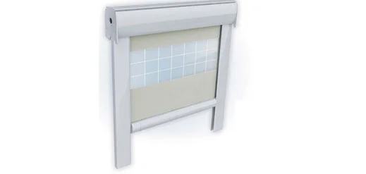 Tenda a cassonetto, con attacco a spallina e asta snodata, con guide laterali antivento dotate di doppio spazzolino. Il telo scorre verticalmente, con la possibilità di bloccare il profilo terminale in posizione intermedia. Viteria esposta in acciaio inox.