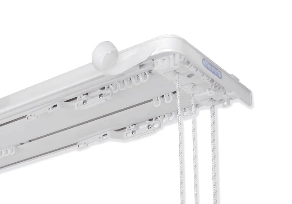 Sistema piatto per tende arriciate a tre canali con mantovana e calate.