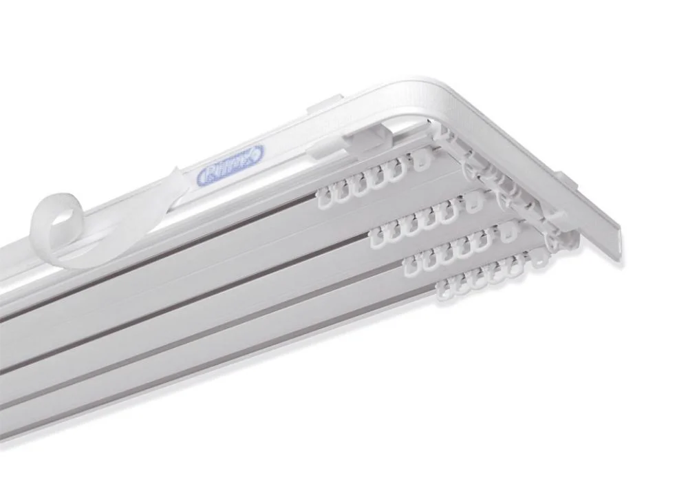Sistema piatto per tende arriciate a quattro canali a strappo con mantovane e calate.
