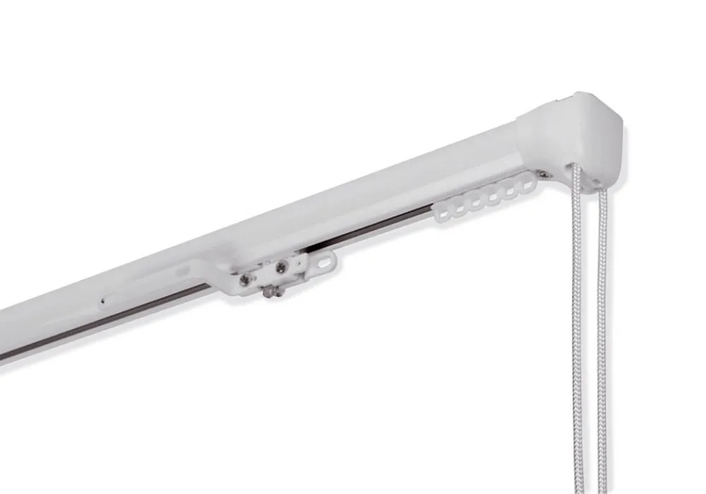 Sistema per tende arricciate con movimentazione a corde guidate, indicato per grandi ambienti con tendaggi di peso massimo 80 kg e larghezza massima 1200 cm.