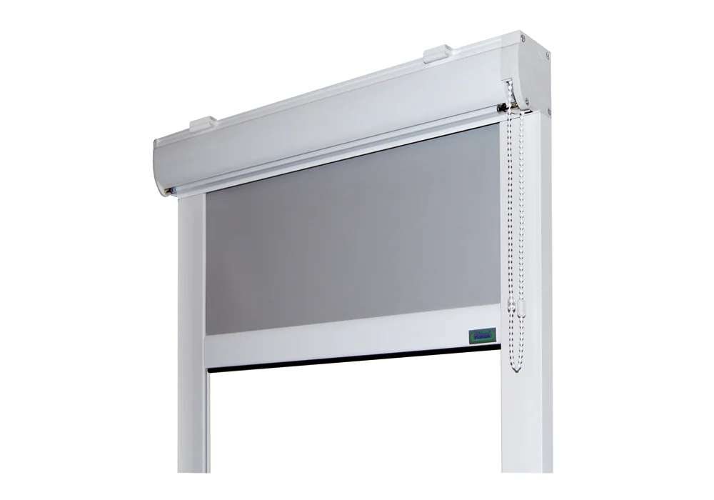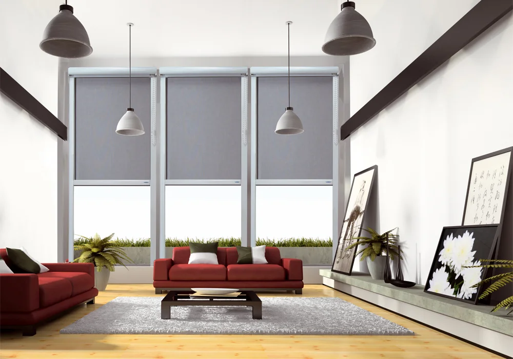 Sistema per tende a rullo con cassonetto e guide laterali con azionamento a catenella per uso di ambienti interni.